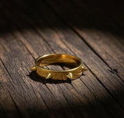This bold, 18K gold-finished ring is designed for those who want their jewelry to pack a powerful punch. Featuring a continuous band of high-polished cone spikes, it seamlessly fuses rebellious punk energy with a luxurious, modern aesthetic.