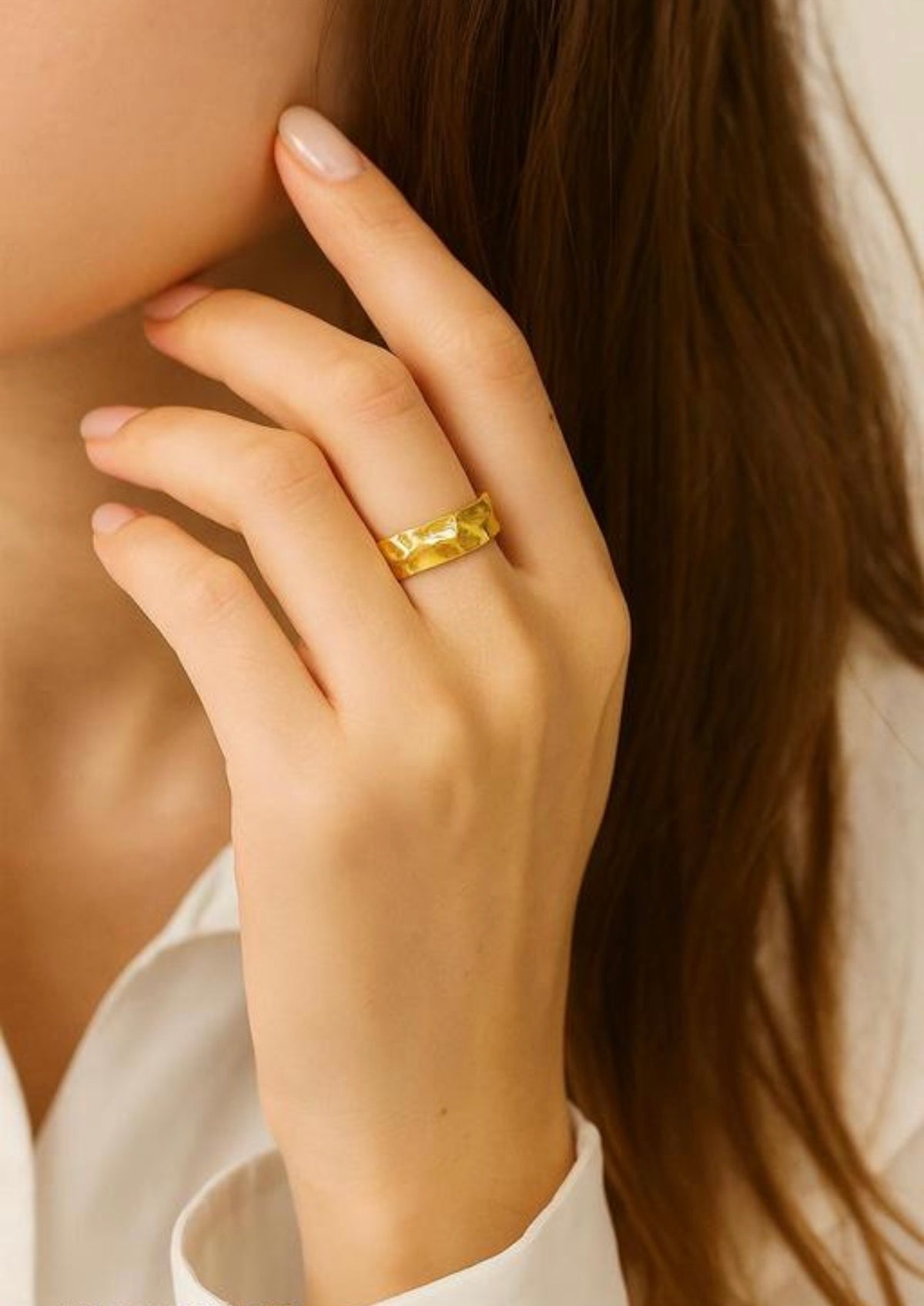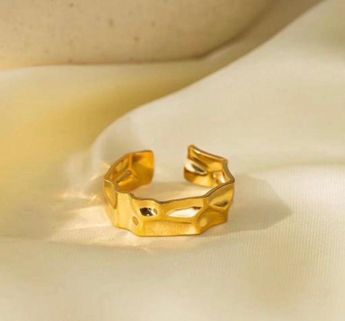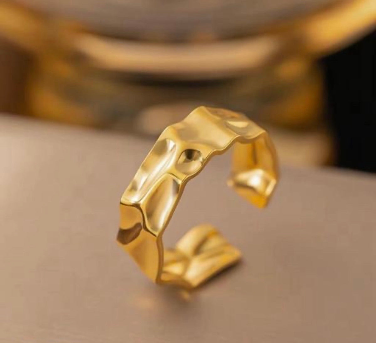 The surface is characterized by a hammered or rippled texture, designed to mimic the appearance of liquid gold that has solidified. This creates a multi-faceted surface that catches and reflects light from different angles.