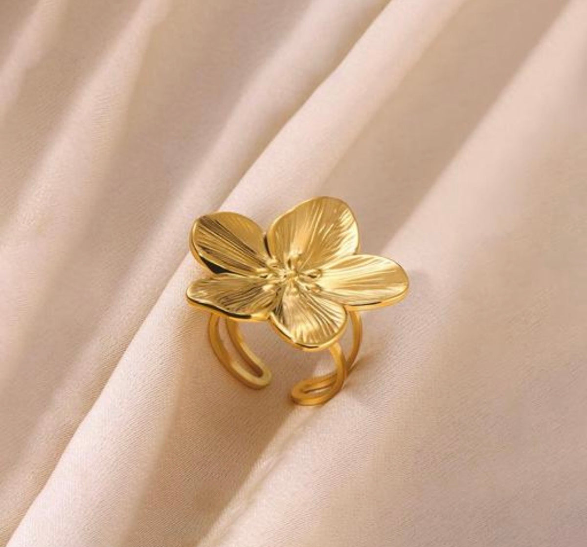 • Design: The ring features a large, blooming flower with five rounded petals. The center of the flower is slightly recessed, mimicking the natural anatomy of a blossom.